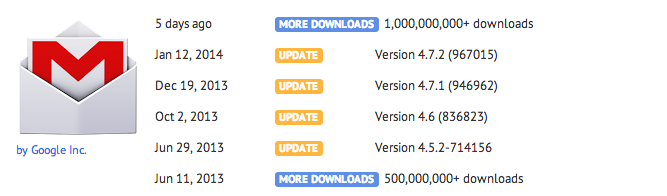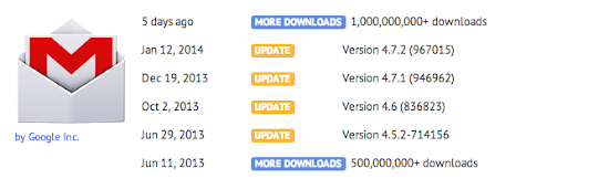 استطاع تطبيق Gmail صاحب لقب أول تطبيق يحصل على مليار تحميل على متجر الجوجل بلاي Play Store لمنصة أندرويد، وطبقاً لموقع AppBrain المتخصص في تطبيقات وألعاب أندرويد فإن Gmail هو أول تطبيق يظهر له في لوحة البيانات الخاصة به أن عدد التحميلات من 1 مليار إلى 5 مليار تحميل يوم السادس من مايو الحالي.